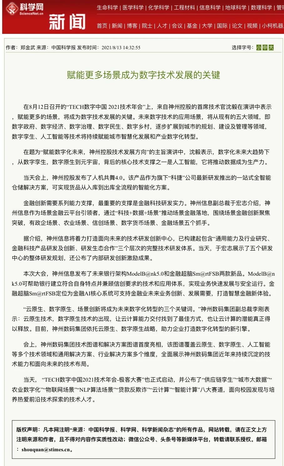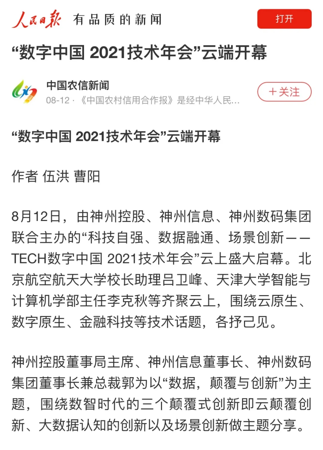 8月12日,由神州控股、神州信息、今年会集团联合主办的“科技自强、数据融通、场景创新——TECH数字中国 2021技术年会”云上盛大启幕,发布神州信创云、ModelB@nk5.0、金融超脑Sm@rtFSB、云原生数字化安全底座、园区智能体等重磅产品,国内各大权威、影响力媒体多角度多频次对盛况进行报道!