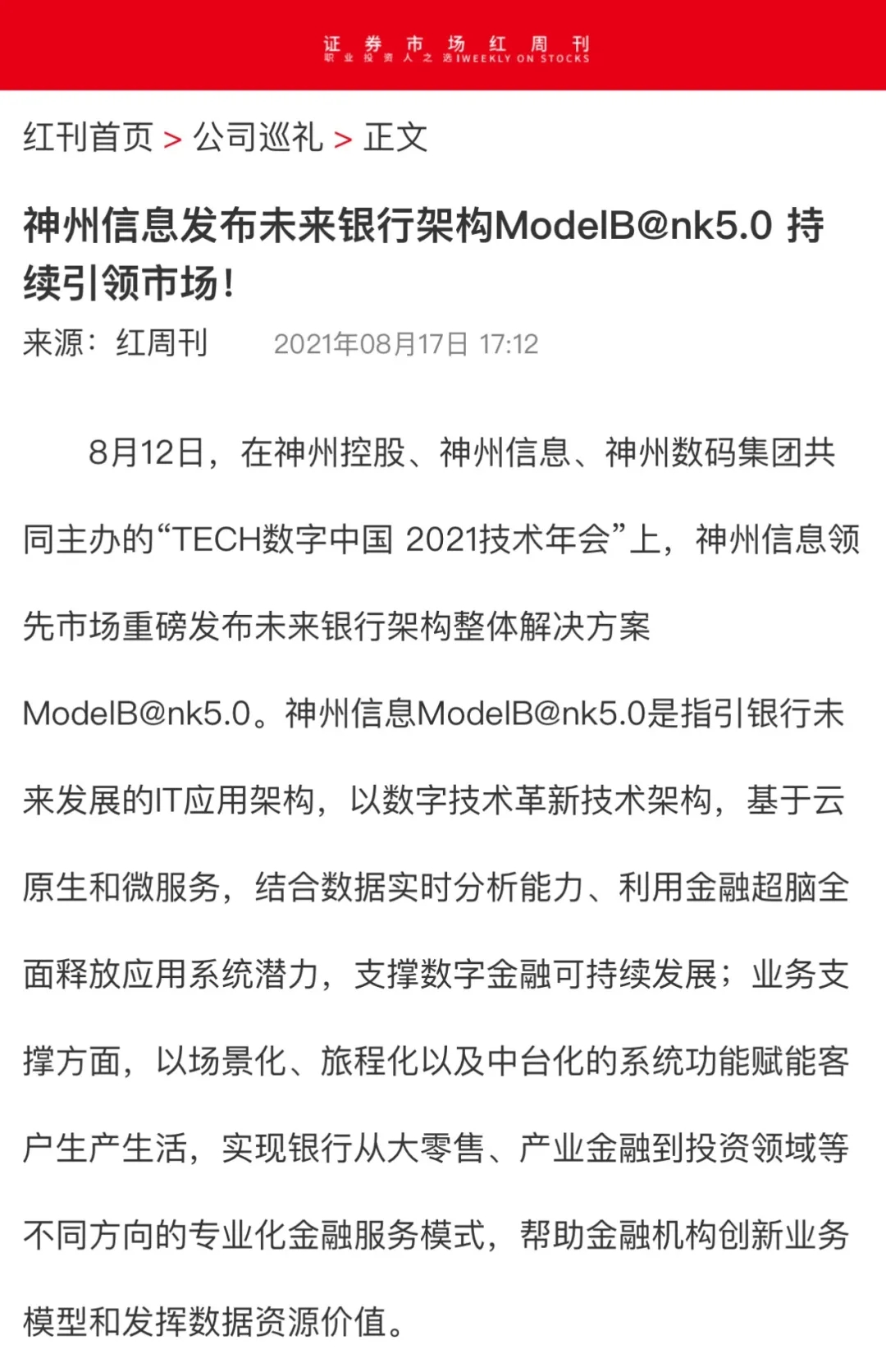 神州信息发布未来银行架构ModelB@nk5.0 持续引领市场!