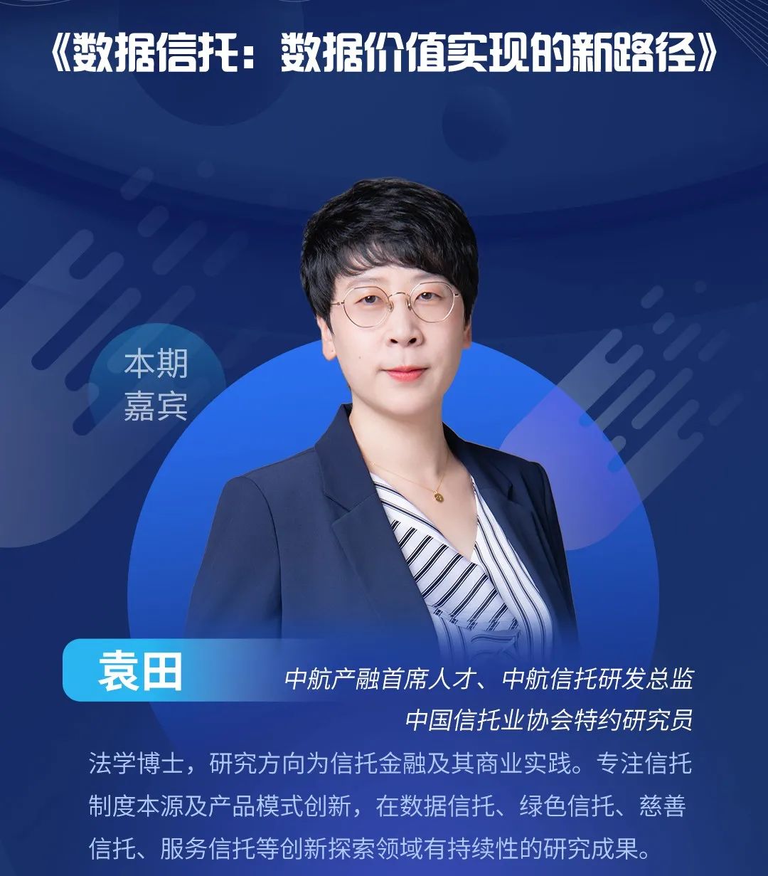 导读:随着数字经济规模的日渐扩大以及数字化发展进程的不断加速,数据产权问题开始受到多方关注。作为数据要素在实现商业化与市场化过程中的核心基础设施,数据产权如何才能更好的发挥自身价值?近日,中航产融首席人才、中航信托研发总监、中国信托业协会特约研究员袁田,受邀作为数字金融公益直播课第四期主讲嘉宾,以《数据信托:数据价值实现的新路径》为主题进行了观点分享。