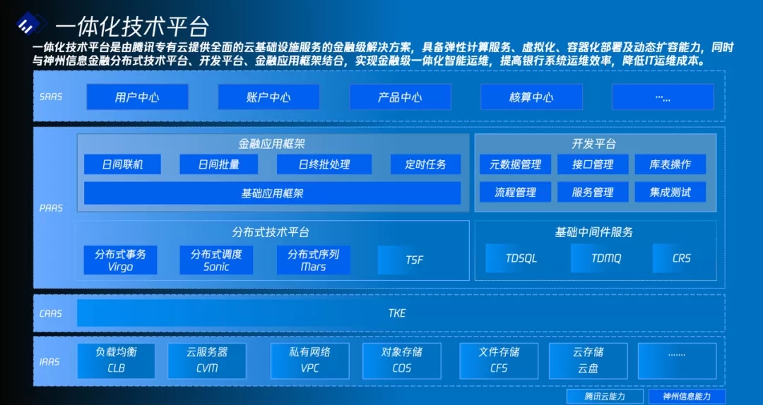 一体化技术平台是由腾讯专有云提供全面的云基础设施服务的金融级解决方案,具备弹性计算服务、虚拟化、容器化部署及动态扩容能力,包含自动化部署、系统监控、分布式协同、远程过程调用、任务调度和资源管理以及分布式文件系统,SAAS应用自助分析、链路监控、配置中心、业务集成化监控、应用生命周期管理等丰富的功能,同时与神州信息金融分布式技术平台、开发平台、金融应用框架结合,实现金融级一体化智能运维,提高银行系统运维效率,降低IT运维成本。